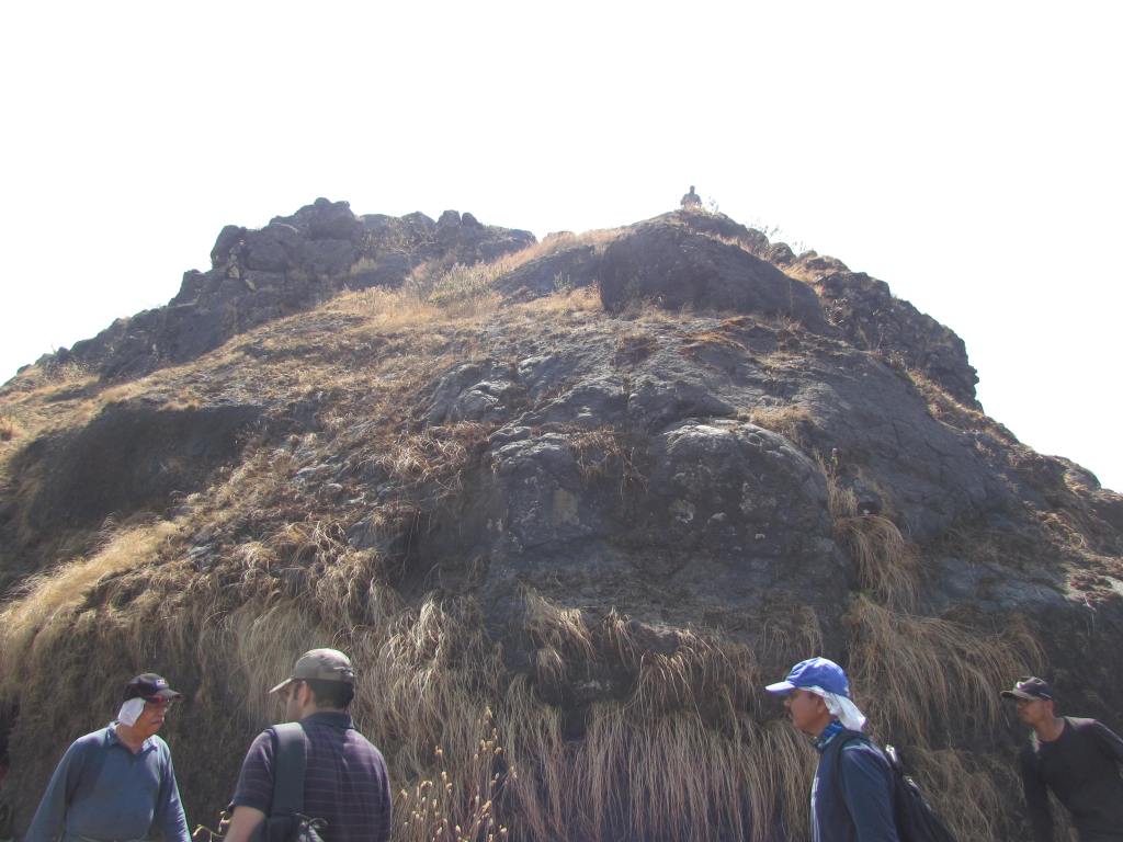 There is a small village called Gajarewadi consisting of probably not more than 15 houses from where the path to Kokandiva begins. Most of the passage has dense forest around it. First kilometer was a cakewalk and then the upward climb began. It was a continuous upward climb on a narrow passage. The path was covered with dried leaves and had loose soil and gravel. There were some difficult passes and steep rocks to climb as we approached the top. Some members of GGIM had already gone ahead and tied ropes for support, so we could overcome the tough stretch easily. The summit is made up of huge assembly of rocks about 50 feet tall. There is a cave at the bottom of the summit surrounded by a small flat stretch. Within an hour we reached the cave.