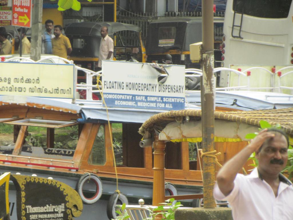 Life in backwaters is a special feature of Kerala. There are narrow stretches of dry land in the backwaters and houses are built a few feet away from the water. In fact, the houses are so close to the water that an item tossed from the house can easily land into the water. Boats play a vital role in the lives of people. It is impossible for anyone to survive without boating skills. I was amused to see a floating Homeopathy dispensary sailing in the backwaters at Alappuzha.